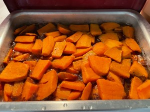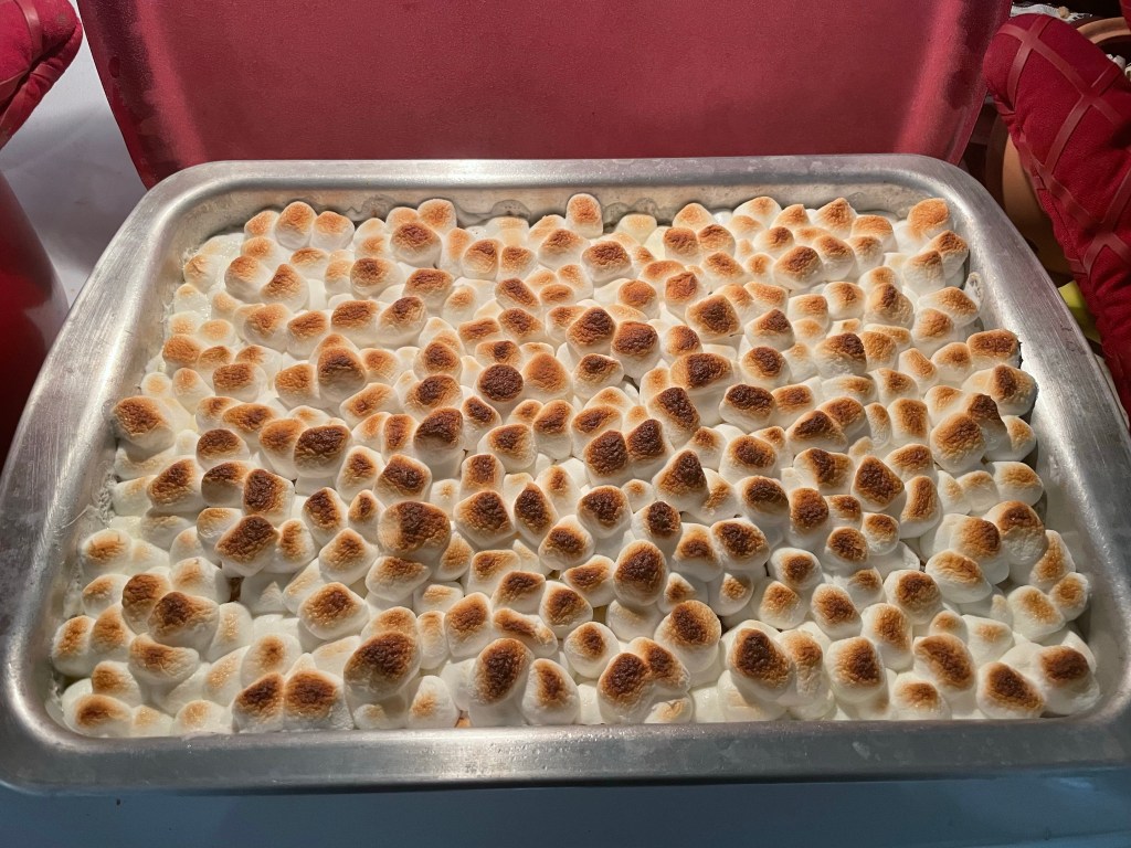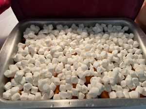 Peel and cut sweet potatoes into 2 inch chunks, slice 1/2 inch thick. Boil potatoes until tender, but not mushy. Drain and keep 1/2 – 3/4 cup water. Add brown sugar and regular sugar to reserved water. Cook down sugar with butter, salt, and cinnamon. Boil about 10-15 minutes. Spray 9×13 pan with Pam and put sweet potatoes in pan. Pour sugar syrup on top. Bake at 350 degrees for 30 minutes. Add marshmallows and broil until toasted.
