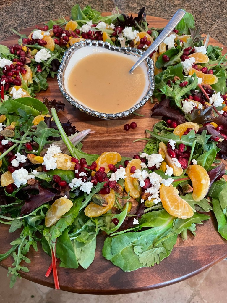 Arrange oranges, pistachios, and pomegranate arils over top of greens. Sprinkle with goat cheese.